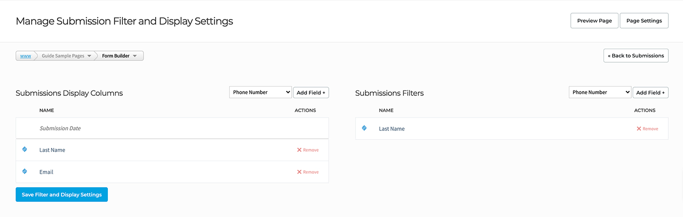 With a newly released update to the Form Builder page type, clients now have the ability to choose what display fields are pulled in from the form, and can even choose form fields to add to their filtering options using the "Filter & Display Settings" button in the top right of the View Submissions page on any form.